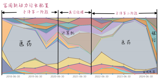 由上可以看出,在管理富国新动力的两个阶段里,都是以医药行业为主,然后再据行情做一些行业的分散。在其它经理管理的一年中,行业配置较为均衡。